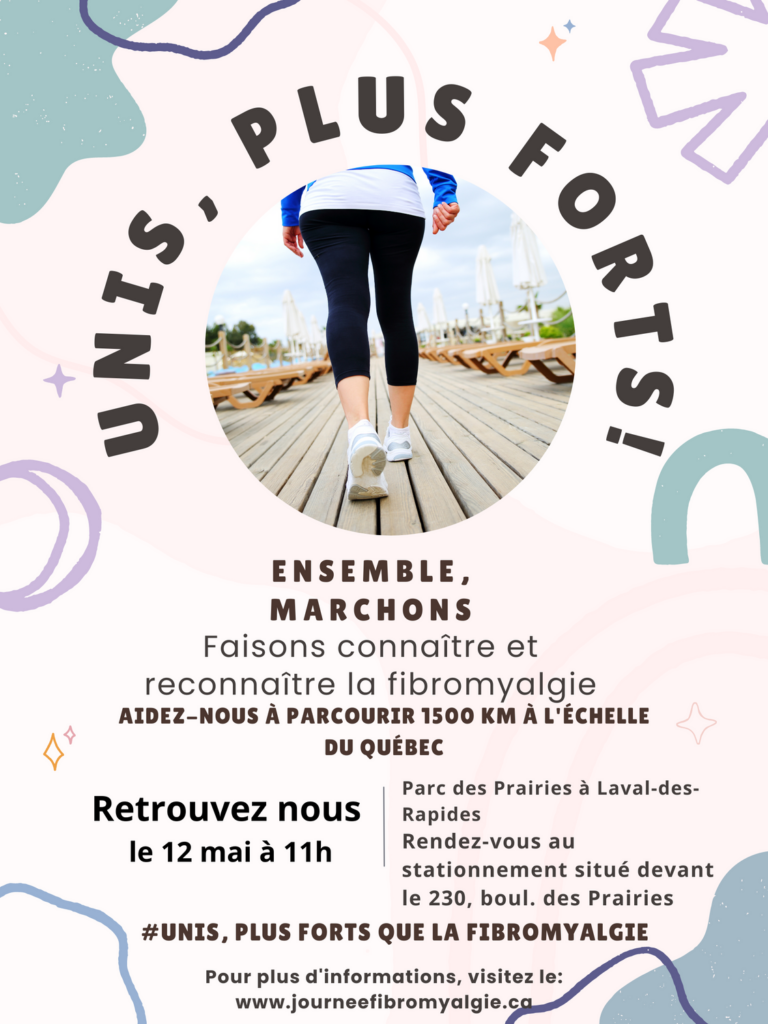 Our association has joined forces with other fibromyalgia associations in Quebec and the SQF (Société Québécoise de la fibromyalgie) to highlight International Fibromyalgia Awareness Day. Organized walks will take place all across Quebec. Increasing visibility was one of our objectives, but we also wanted to awaken a sense of kinship between the associations by working on a common goal. This day presents an opportunity to invite your family and friends to show their support. It’s also a chance for them to learn more about this condition. Additionally, each association will offer virtual conferences. Check out the SQF website: www.fibromyalgiaday.ca for the schedule of events for this wonderful week, which will take place between May 9, 2022, and May 15, 2022.